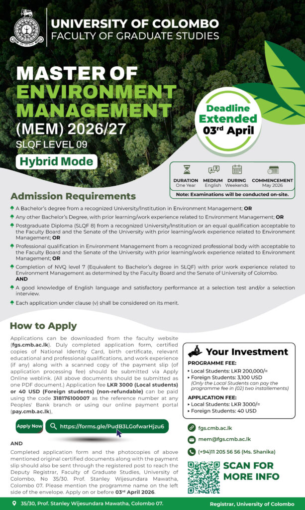 The Faculty of Graduate Studies of the University of Colombo will be commencing its tenth programme on Master of Environment Management in April 2024. This is an interdisciplinary programme that focuses on ecological, legal, social and economic aspects of environment management. The programme is designed to cater both amateurs as well as professionals to develop their career in Environment Management.