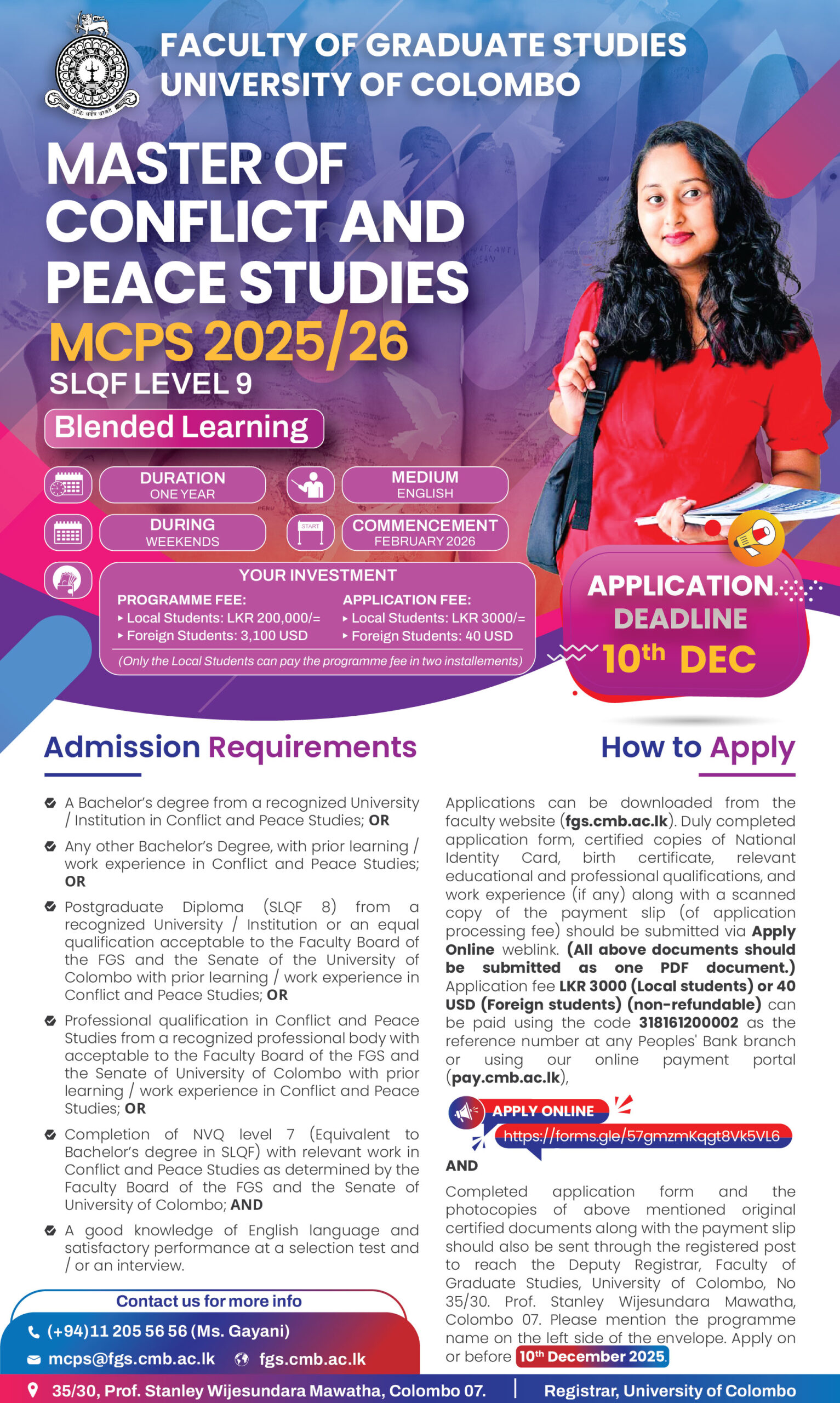 - Professional qualification in Conflict and Peace Studies from a recognized professional body with acceptable to the Faculty Board of the FGS and the Senate of University of Colombo with prior learning / work experience in Conflict and Peace Studies; OR