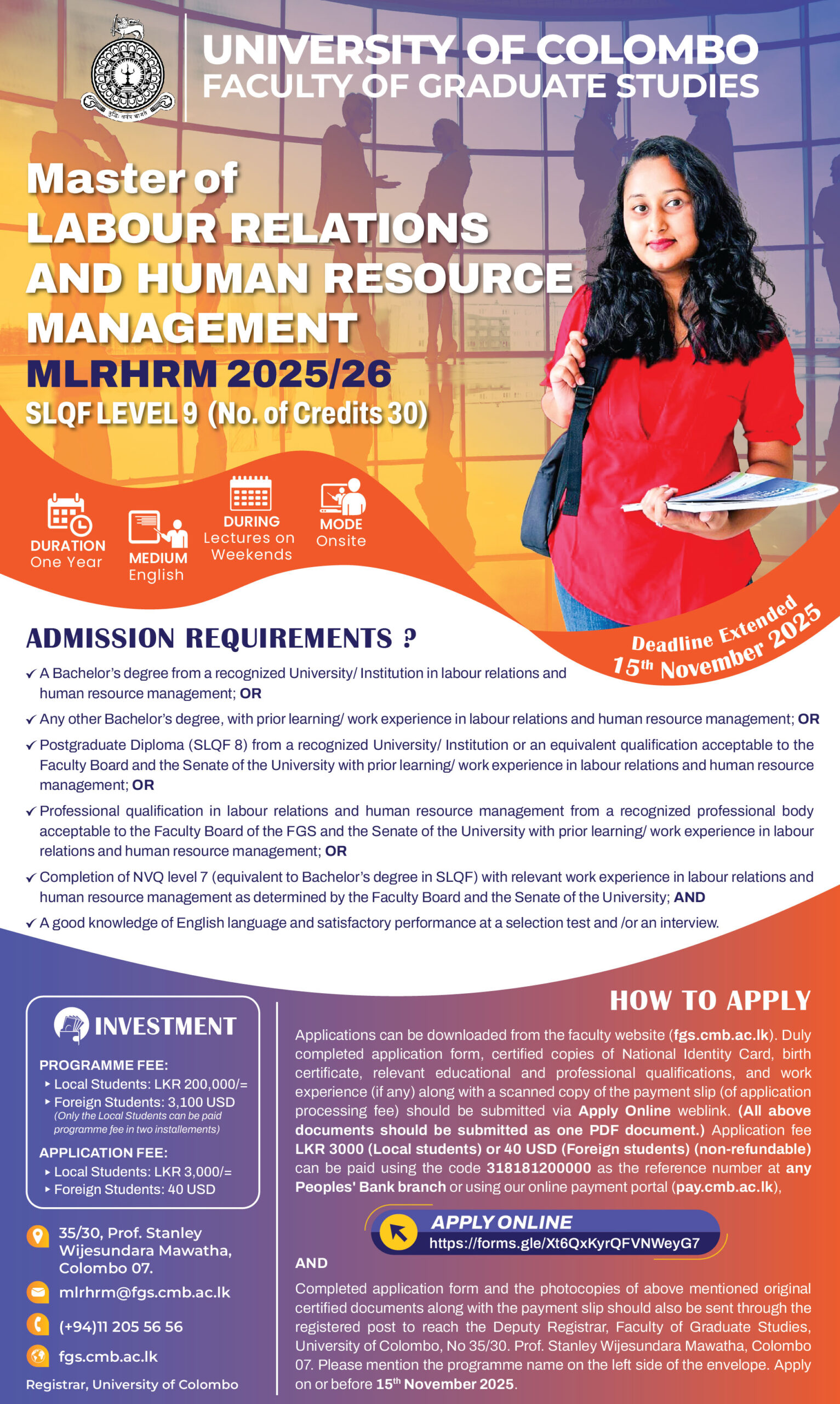 - Completion of NVQ level 7 (equivalent to Bachelor’s degree in SLQF) with relevant work experience in labour relations and human resource management as determined by the Faculty Board and the Senate of the University.