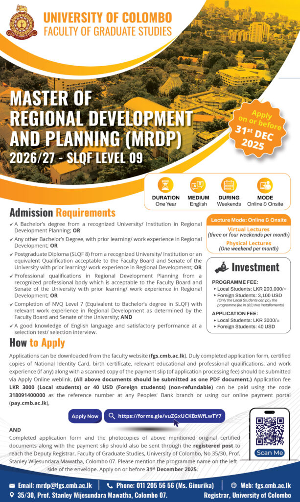 - Postgraduate Diploma (SLQF 8) from a recognized University/Institution or an equivalent Qualification acceptable to the Faculty Board and Senate of the University with prior learning/work experience in Regional Development; or